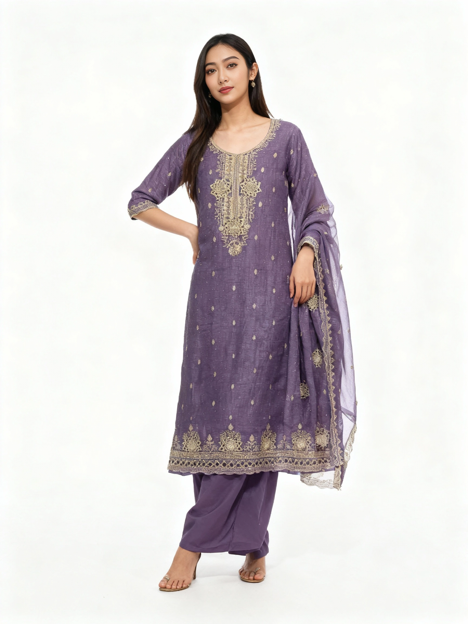 This embroidered suit set highlights delicate golden threadwork that enhances the beauty of the fabric while maintaining a balanced and sophisticated appearance. The detailed embroidery reflects traditional craftsmanship and adds a festive touch to the outfit.