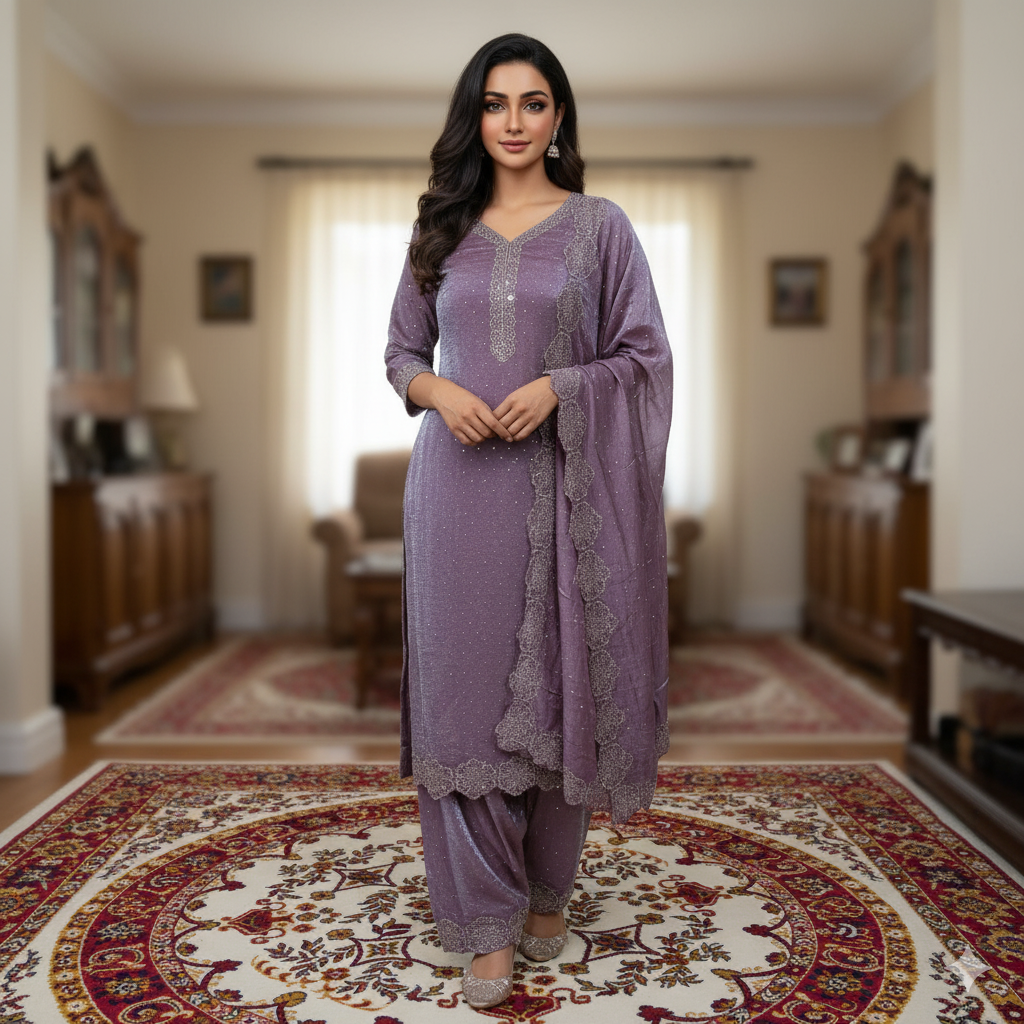 The Celebrity Premium Fendi Silk – Swarovski Embroidered Suit Set from Punjabi Threads – Suits & Stitches is crafted with high-quality Fendi Silk fabric, known for its rich shine, buttery smooth texture, and effortless drape.