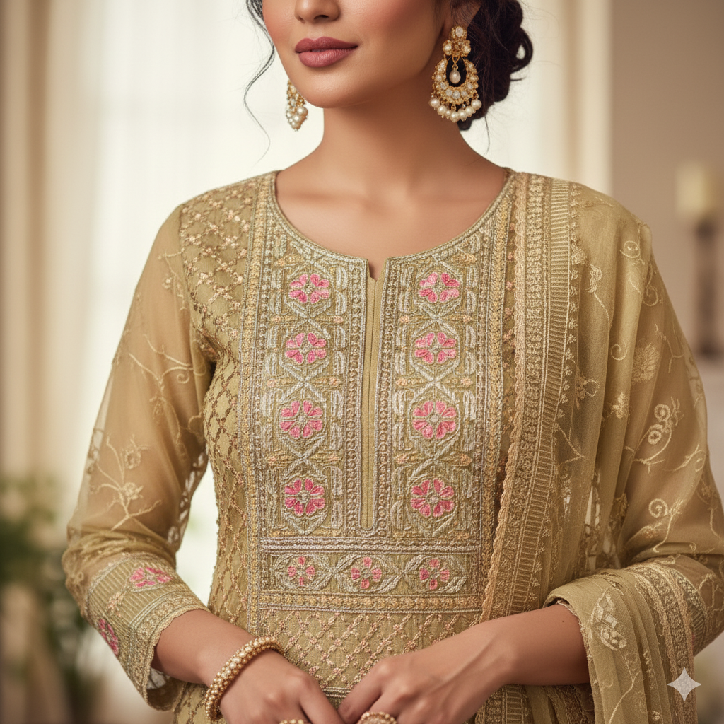 👗 Includes: Kurta Fabric, Heavy Embroidered Dupatta, Bottom Fabric (Unstitched 3-piece set)