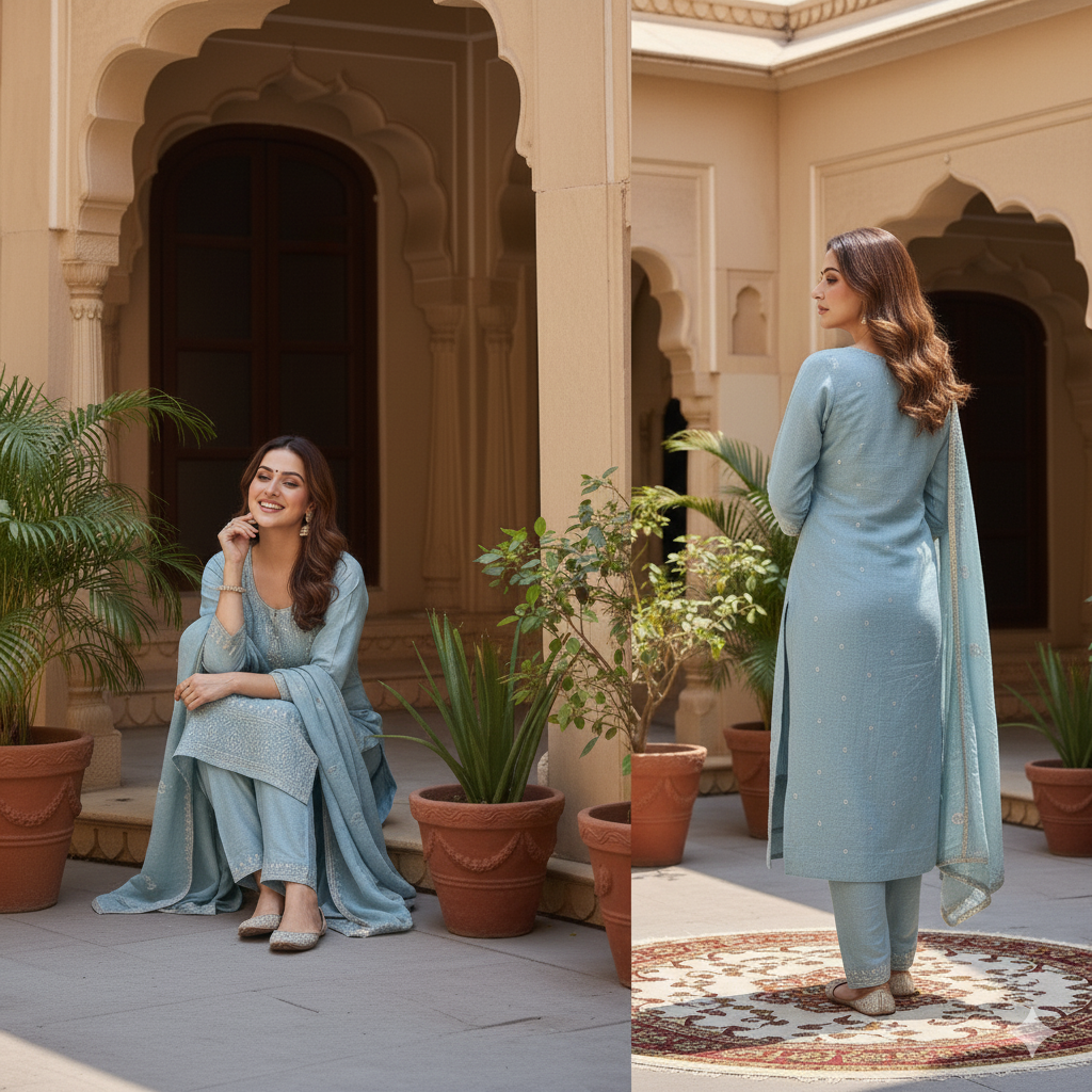 Elevate your festive style with our Gold Crush โ Sea Blue Suit Set, crafted from rich crush-finish fabric that delivers a premium sheen and luxurious drape.