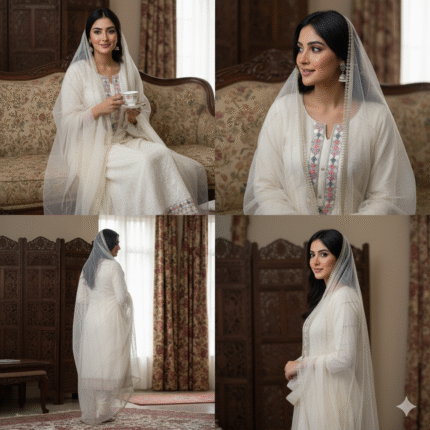 The beautifully designed dupatta carries a soft printed pattern with golden edges, adding a luxurious finishing touch.