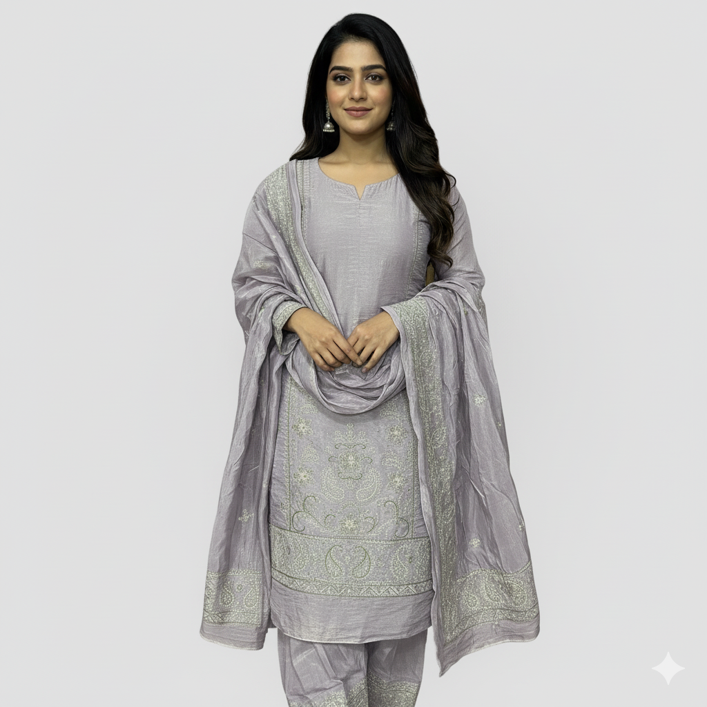 The soft lavender colour creates a graceful and sophisticated appearance, while delicate embroidery enhances the beauty of the outfit. The subtle shimmer texture adds a luxurious finish, making this suit set perfect for weddings, festive celebrations, and cultural events.