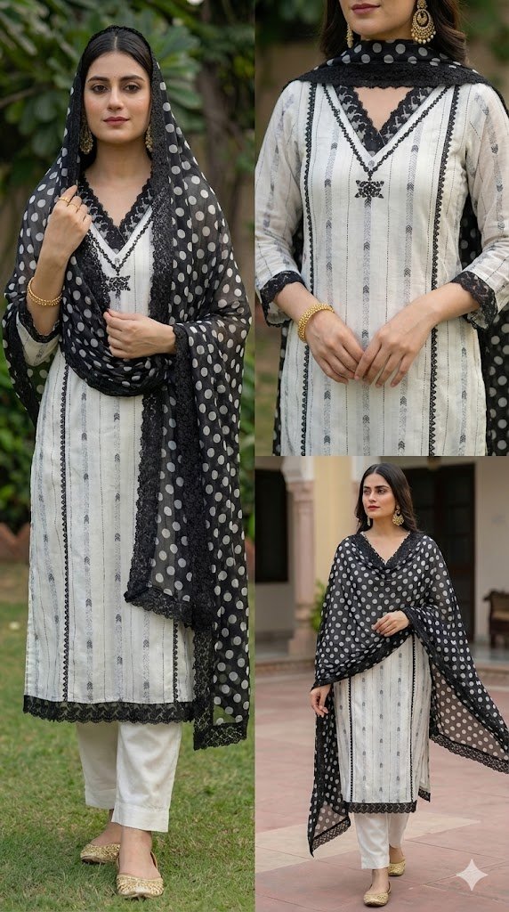 Paired with the kurta is a stunning black polka dot dupatta, which adds contrast and personality to the outfit. The dupatta features soft fabric with lace edging, creating a beautiful balance between playful and elegant. It can be styled in multiple ways—draped over the shoulders, wrapped neatly, or styled freely for a relaxed look.