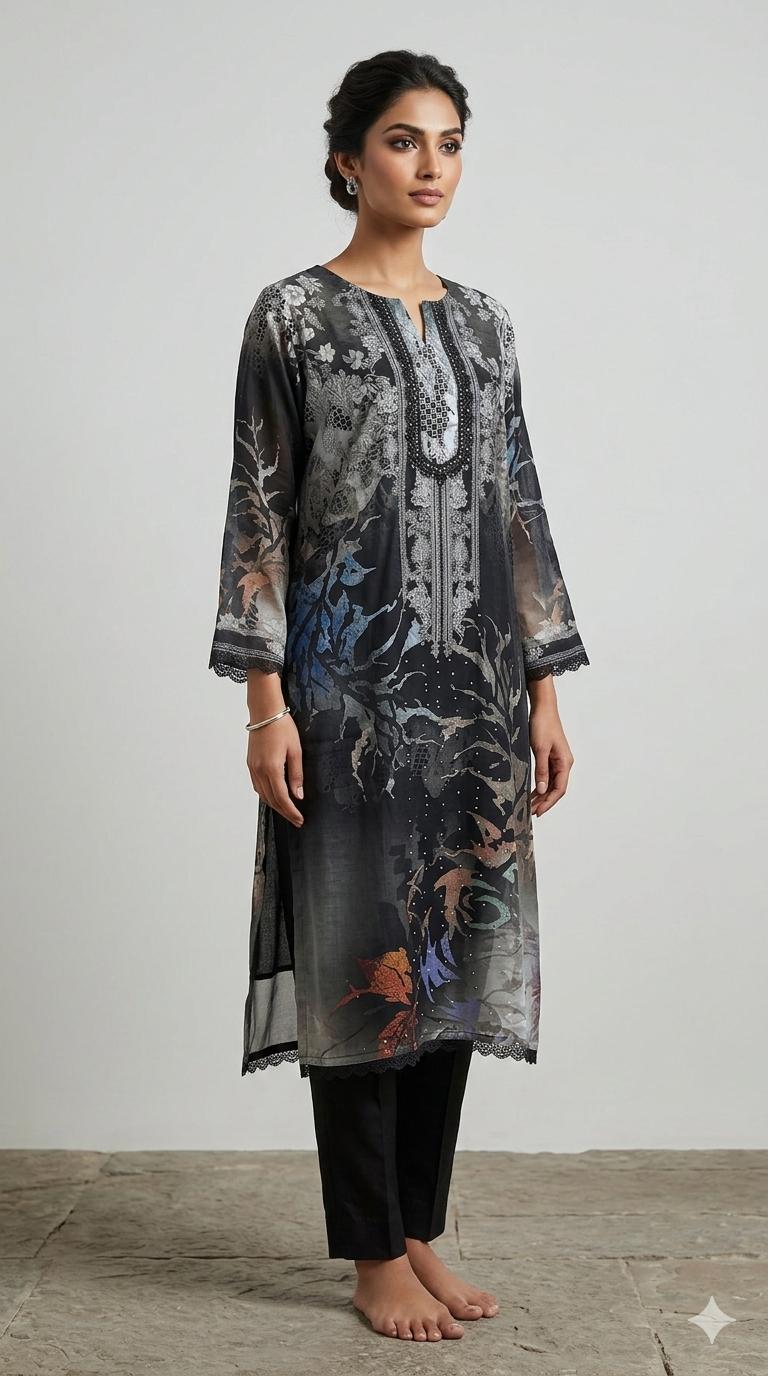 The kurta features detailed printed artwork with subtle embroidery-inspired design, paired with matching pants and a beautifully coordinated dupatta. Designed for modern women who value comfort without compromising style.