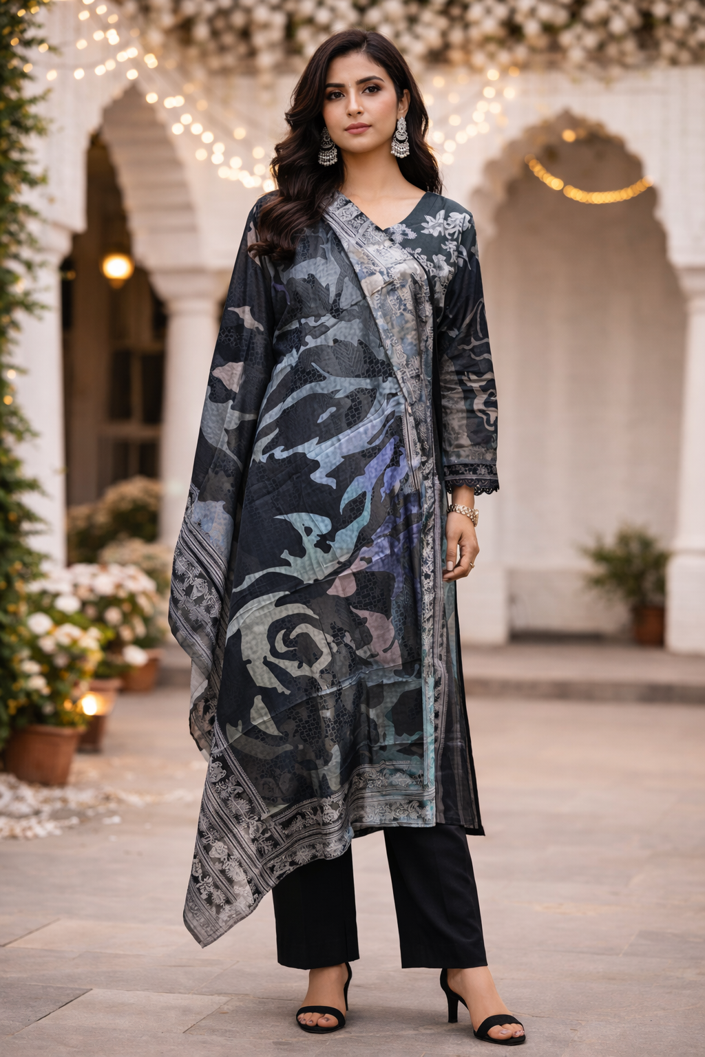 Maslin Cotton Printed Suit Set – Black & Grey Elegance