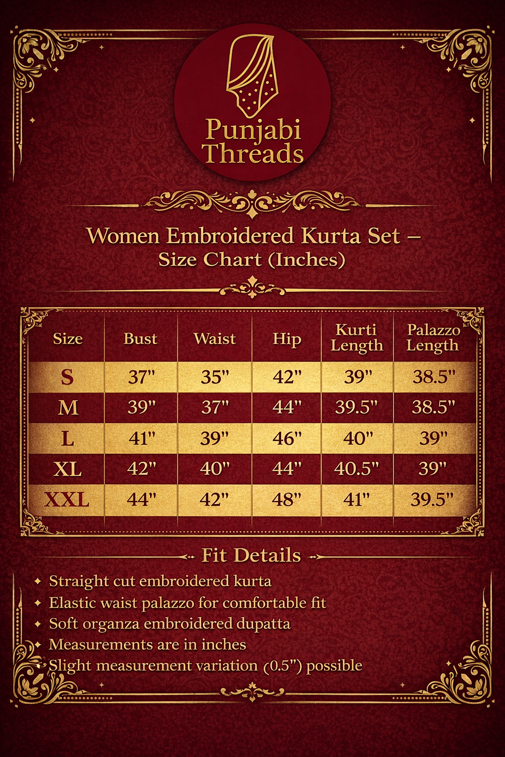 Crafted from premium maslin fabric, the kurta and palazzo provide a soft, breathable feel that ensures comfort throughout the day. The beautifully detailed Kashmiri-inspired embroidery enhances the neckline and borders, giving the outfit a rich and royal appearance.
