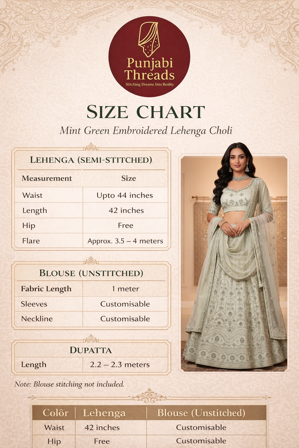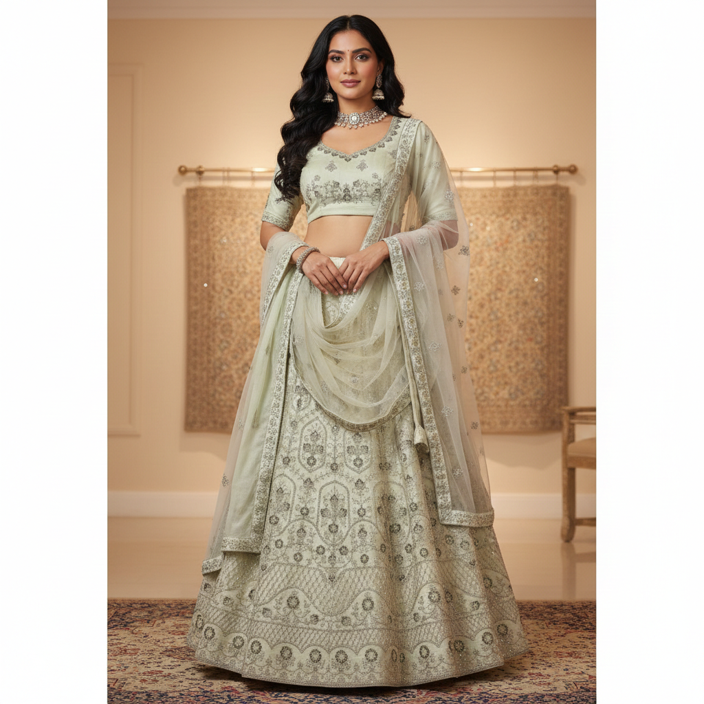 Whether you’re a bride, bridesmaid, wedding guest, or attending an engagement, reception, or festive event, this mint green embroidered lehenga choli promises a standout presence with timeless charm and premium craftsmanship.