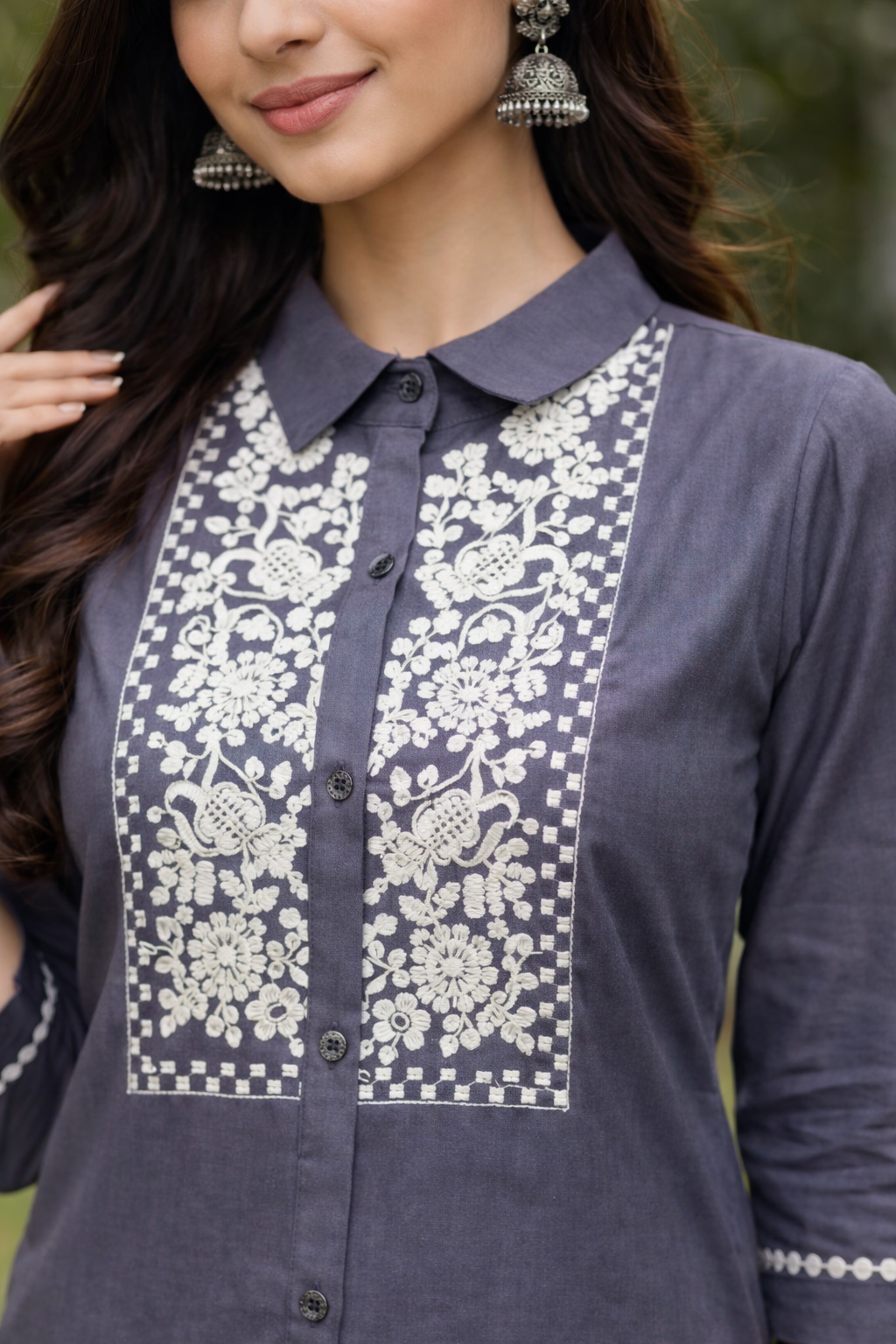Designed for both style and ease, this cord set combines embroidered elegance with breathable comfort. The lightweight maslin fabric allows freedom of movement and keeps you cool throughout the day. The coordinated design ensures a cohesive outfit without the need to mix and match separately.