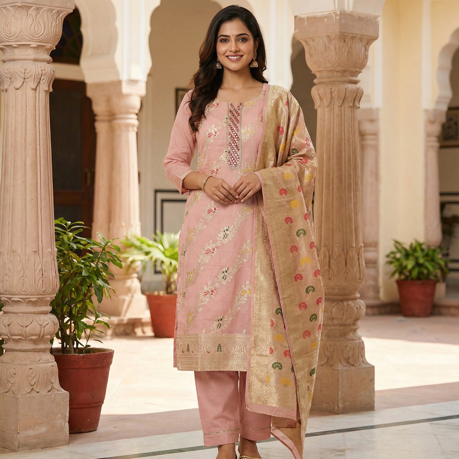 The Soft Peach Printed Suit Set is a timeless ethnic ensemble designed for women who love subtle elegance with traditional charm. Crafted in a soothing peach shade, this outfit blends delicate prints with graceful detailing, making it perfect for festive celebrations, family gatherings, and elegant everyday wear.