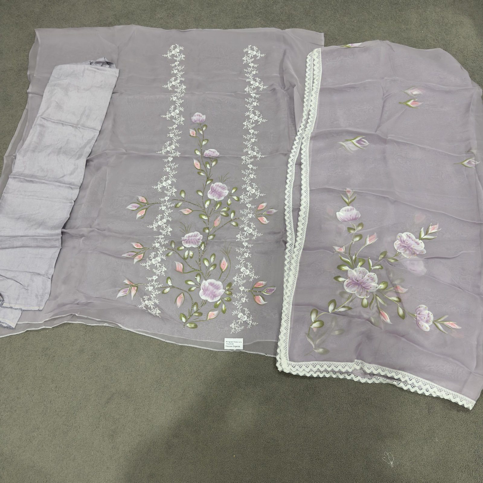 Grace meets sophistication in our Viscose Organza – Lavender Floral Embroidered Suit Set, exclusively from Punjabi Threads – Suits & Stitches.