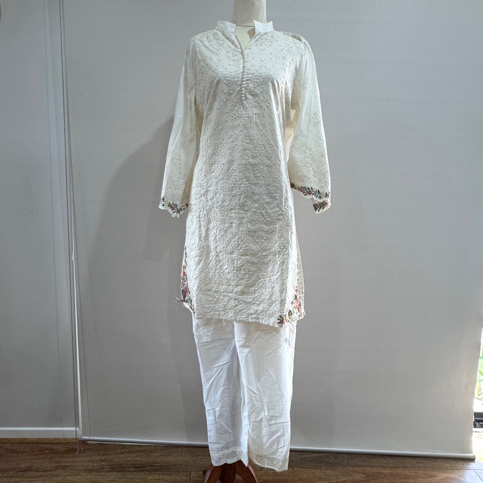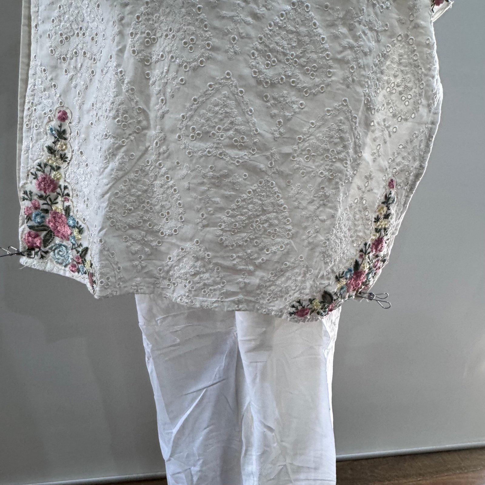 The kurta is crafted from breathable cotton with delicate chikankari embroidery, offering a refined and traditional aesthetic.